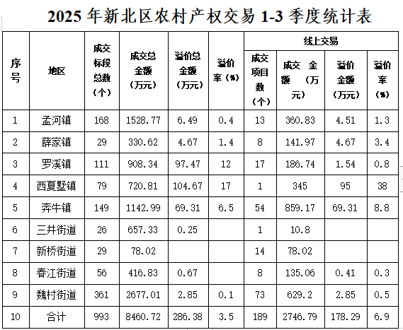 2025年1-3季度,新北区农村产权交易中心共完成交易993宗,成交总金额为8460.72万元,溢价金额286.38万元。其中线上竞价项目共完成交易189宗,成交金额为2746.79万元,溢价金额178.29万元,溢价率为6.9%,成交金额与2024年同期相比增幅35.76%。详见下表: